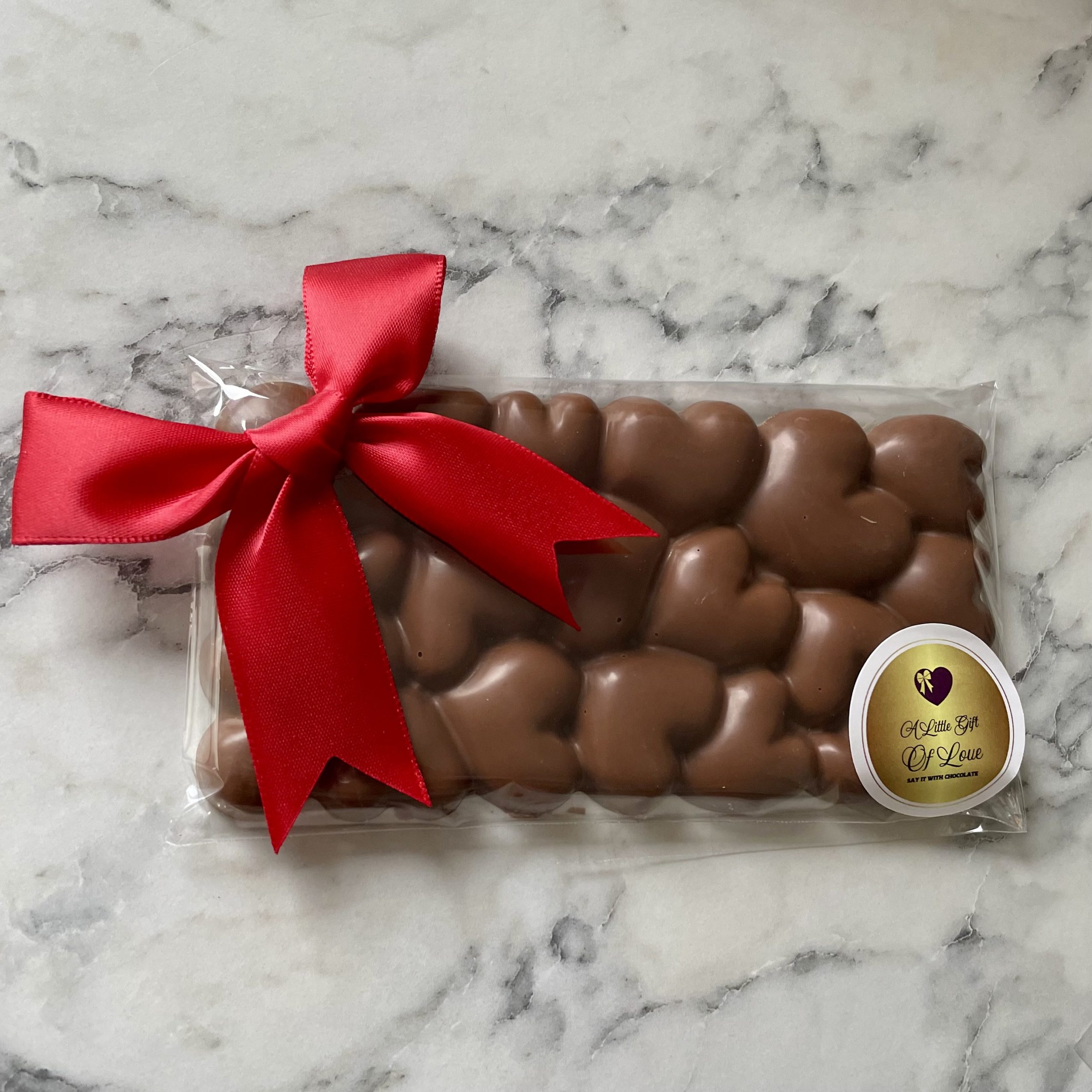 A smooth and creamy chocolate bar with a fun bubble design made up of cute heart shapes.